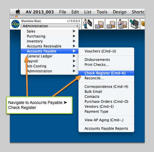 The Check Register allows you to keep track of the Checks you write as well as miscellaneous checking account entries. There are three types of Checks within AcctVantage: AP Disbursement Checks, Payroll Checks, and Quick Checks.